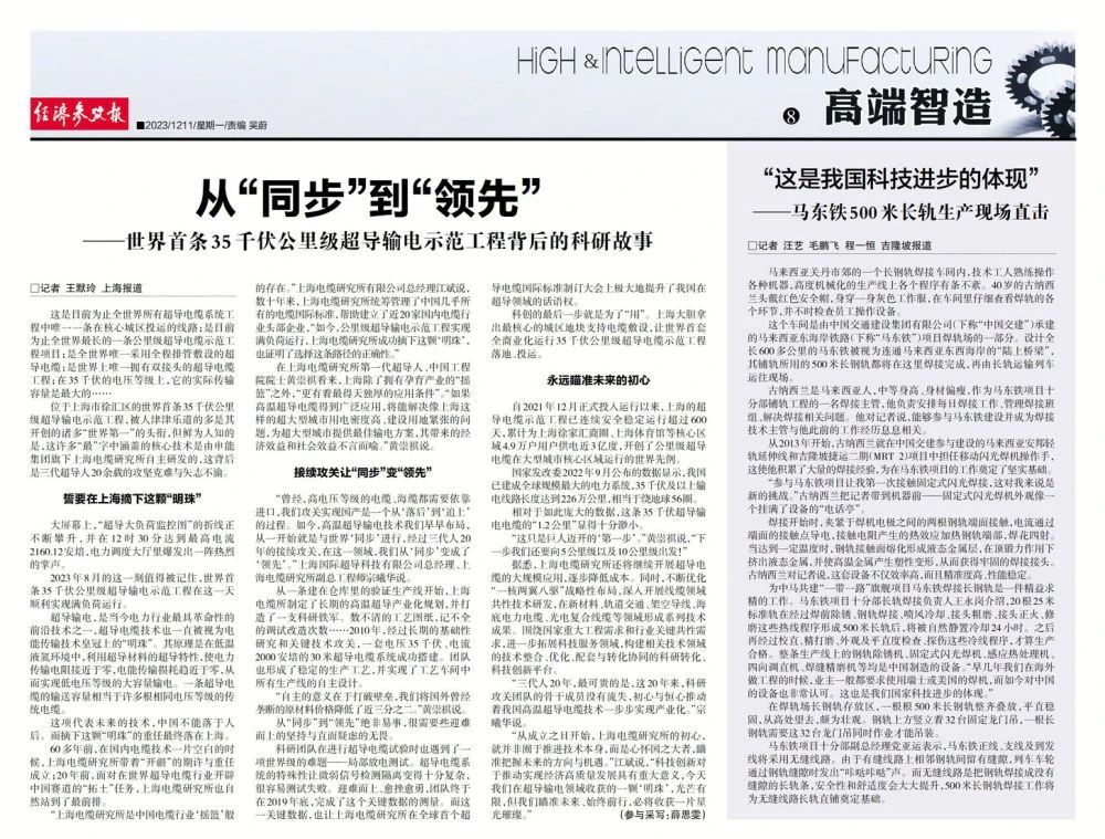 這是目前為止全世界所有超導(dǎo)電纜系統(tǒng)工程中唯一一條在核心城區(qū)投運(yùn)的線(xiàn)路;是目前為止全世界最長(zhǎng)的一條公里級(jí)超導(dǎo)電纜示范工程項(xiàng)目;是全世界唯一采用全程排管敷設(shè)的超導(dǎo)電纜;是世界上唯一擁有雙接頭的超導(dǎo)電纜工程;在35千伏的電壓等級(jí)上,它的實(shí)際傳輸容量是最大的……位于上海市徐匯區(qū)的世界首條35千伏公里級(jí)超導(dǎo)輸電示范工程,被人津津樂(lè)道的多是其開(kāi)創(chuàng)的諸多“世界第一”的頭銜,但鮮為人知的是,這許多“最”字中涵蓋的核心技術(shù)是由申能集團(tuán)旗下上海電纜研究所有限公司自主研發(fā)的,這背后是三代超導(dǎo)人20余載的攻堅(jiān)克難與矢志不渝。大屏幕上,“超導(dǎo)大負(fù)荷監(jiān)控圖”的折線(xiàn)正不斷攀升,并在12時(shí)30分達(dá)到最高電流2160.12安培,電力調(diào)度大廳里爆發(fā)出一陣熱烈的掌聲。2023年8月的這一刻值得被記住,世界首條35千伏公里級(jí)超導(dǎo)輸電示范工程在這一天順利實(shí)現(xiàn)滿(mǎn)負(fù)荷運(yùn)行。超導(dǎo)輸電,是當(dāng)今電力行業(yè)最具革命性的前沿技術(shù)之一,超導(dǎo)電纜技術(shù)也一直被視為電能傳輸技術(shù)皇冠上的“明珠”。其原理是在低溫液氮環(huán)境中,利用超導(dǎo)材料的超導(dǎo)特性,使電力傳輸電阻接近于零,電能傳輸損耗趨近于零,從而實(shí)現(xiàn)低電壓等級(jí)的大容量輸電。一條超導(dǎo)電纜的輸送容量相當(dāng)于許多根相同電壓等級(jí)的傳統(tǒng)電纜。這項(xiàng)代表未來(lái)的技術(shù),中國(guó)不能落于人后。而摘下這顆“明珠”的重任最終落在上海。60多年前,在國(guó)內(nèi)電纜技術(shù)一片空白的時(shí)候,上海電纜研究所帶著“開(kāi)疆”的期許與重任成立;20年前,面對(duì)在世界超導(dǎo)電纜行業(yè)開(kāi)辟中國(guó)賽道的“拓土”任務(wù),上海電纜研究所也自然站到了最前排。“上海電纜研究所是中國(guó)電纜行業(yè)‘搖籃’般的存在?!鄙虾k娎|研究所有限公司總經(jīng)理江斌說(shuō),數(shù)十年來(lái),上海電纜研究所統(tǒng)籌管理了中國(guó)幾乎所有的電纜國(guó)際標(biāo)準(zhǔn),幫助建立了近20家國(guó)內(nèi)電纜行業(yè)頭部企業(yè),“如今,公里級(jí)超導(dǎo)輸電示范工程實(shí)現(xiàn)滿(mǎn)負(fù)荷運(yùn)行,上海電纜研究所成功摘下這顆‘明珠’,也證明了選擇這條路徑的正確性?!?/section>在上海電纜研究所第一代超導(dǎo)人、中國(guó)工程院院士黃崇祺看來(lái),上海除了擁有孕育產(chǎn)業(yè)的“搖籃”之外,“更有著最得天獨(dú)厚的應(yīng)用條件”。“如果高溫超導(dǎo)電纜得到廣泛應(yīng)用,將能解決像上海這樣的超大型城市用電密度高、建設(shè)用地緊張的問(wèn)題,為超大型城市提供最佳輸電方案,其帶來(lái)的經(jīng)濟(jì)效益和社會(huì)效益不言而喻?!秉S崇祺說(shuō)。接續(xù)攻關(guān)讓“同步”變“領(lǐng)先”“曾經(jīng),高電壓等級(jí)的電纜、海纜都需要依靠進(jìn)口,我們攻關(guān)實(shí)現(xiàn)國(guó)產(chǎn)是一個(gè)從‘落后’到‘追上’的過(guò)程。如今,高溫超導(dǎo)輸電技術(shù)我們?cè)缭绮季?,從一開(kāi)始就是與世界‘同步’進(jìn)行,經(jīng)過(guò)三代人20年的接續(xù)攻關(guān),在這一領(lǐng)域,我們從‘同步’變成了‘領(lǐng)先’?!鄙虾?guó)際超導(dǎo)科技有限公司總經(jīng)理、上海電纜研究所副總工程師宗曦華說(shuō)。從一條建在倉(cāng)庫(kù)里的驗(yàn)證生產(chǎn)線(xiàn)開(kāi)始,上海電纜研究所制定了長(zhǎng)期的高溫超導(dǎo)產(chǎn)業(yè)化規(guī)劃,并打造了一支科研鐵軍。數(shù)不清的工藝圖紙,記不全的調(diào)試改造次數(shù)……2010年,經(jīng)過(guò)長(zhǎng)期的基礎(chǔ)性研究和關(guān)鍵技術(shù)攻關(guān),一套電壓35千伏、電流2000安培的30米超導(dǎo)電纜系統(tǒng)成功搭建。團(tuán)隊(duì)也形成了穩(wěn)定的生產(chǎn)工藝,并實(shí)現(xiàn)了工藝車(chē)間中所有生產(chǎn)線(xiàn)的自主設(shè)計(jì)。“自主的意義在于打破壁壘,我們將國(guó)外曾經(jīng)壟斷的原材料價(jià)格降低了近三分之二?!秉S崇祺說(shuō)。從“同步”到“領(lǐng)先”絕非易事,很需要些迎難而上的堅(jiān)持與直面疑慮的無(wú)畏。科研團(tuán)隊(duì)在進(jìn)行超導(dǎo)電纜試驗(yàn)時(shí)也遇到了一項(xiàng)世界級(jí)的難題——局部放電測(cè)試。超導(dǎo)電纜系統(tǒng)的特殊性讓微弱信號(hào)檢測(cè)隔離變得十分復(fù)雜,很容易測(cè)試失敗。迎難而上、愈挫愈勇,團(tuán)隊(duì)終于在2019年底,完成了這個(gè)關(guān)鍵數(shù)據(jù)的測(cè)量。而這一關(guān)鍵數(shù)據(jù),也讓上海電纜研究所在全球首個(gè)超導(dǎo)電纜國(guó)際標(biāo)準(zhǔn)制訂大會(huì)上極大地提升了我國(guó)在超導(dǎo)領(lǐng)域的話(huà)語(yǔ)權(quán)。科創(chuàng)的最后一步就是為了“用”。上海大膽拿出最核心的城區(qū)地塊支持電纜敷設(shè),讓世界首套全商業(yè)化運(yùn)行35千伏公里級(jí)超導(dǎo)電纜示范工程落地、投運(yùn)。永遠(yuǎn)瞄準(zhǔn)未來(lái)的初心自2021年12月正式投入運(yùn)行以來(lái),上海的超導(dǎo)電纜示范工程